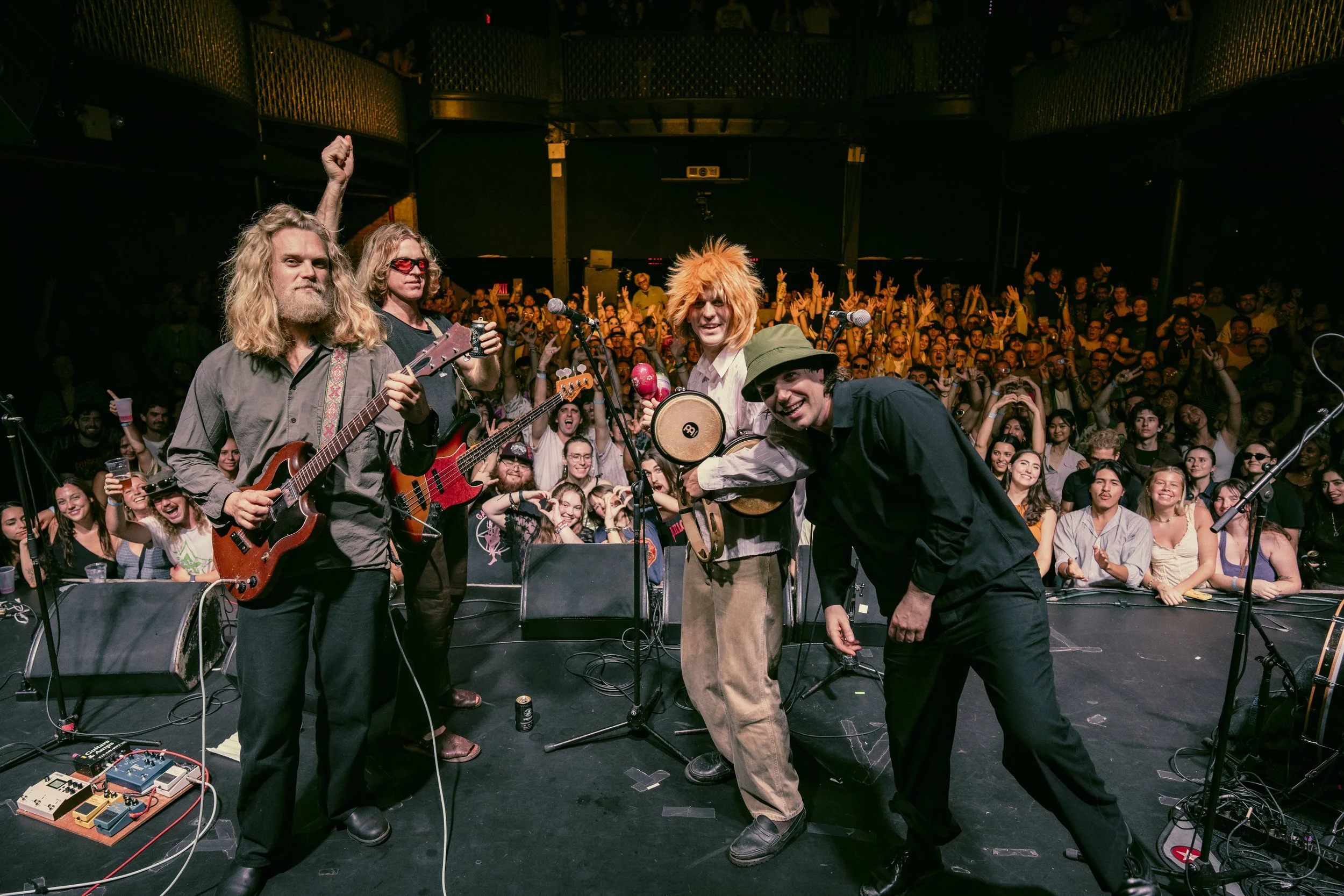 The whole venue started a very rowdy soccer stadium-style chant of Babe Rainbow’s name to get them to appear for some additional tunes. Honestly, it was the loudest encore chant I had heard in a minute– those last two songs really got the crowd riled up. After disappearing backstage for a bit, the band came out for a series of encores. Dowling returned to stage wearing a blonde wig (on top of his already blonde hair) which was a silly and fun touch. In one particularly charming moment, the band posed for a portrait with the audience, courtesy of our photographer Tommy Krause, (pictured below!)
