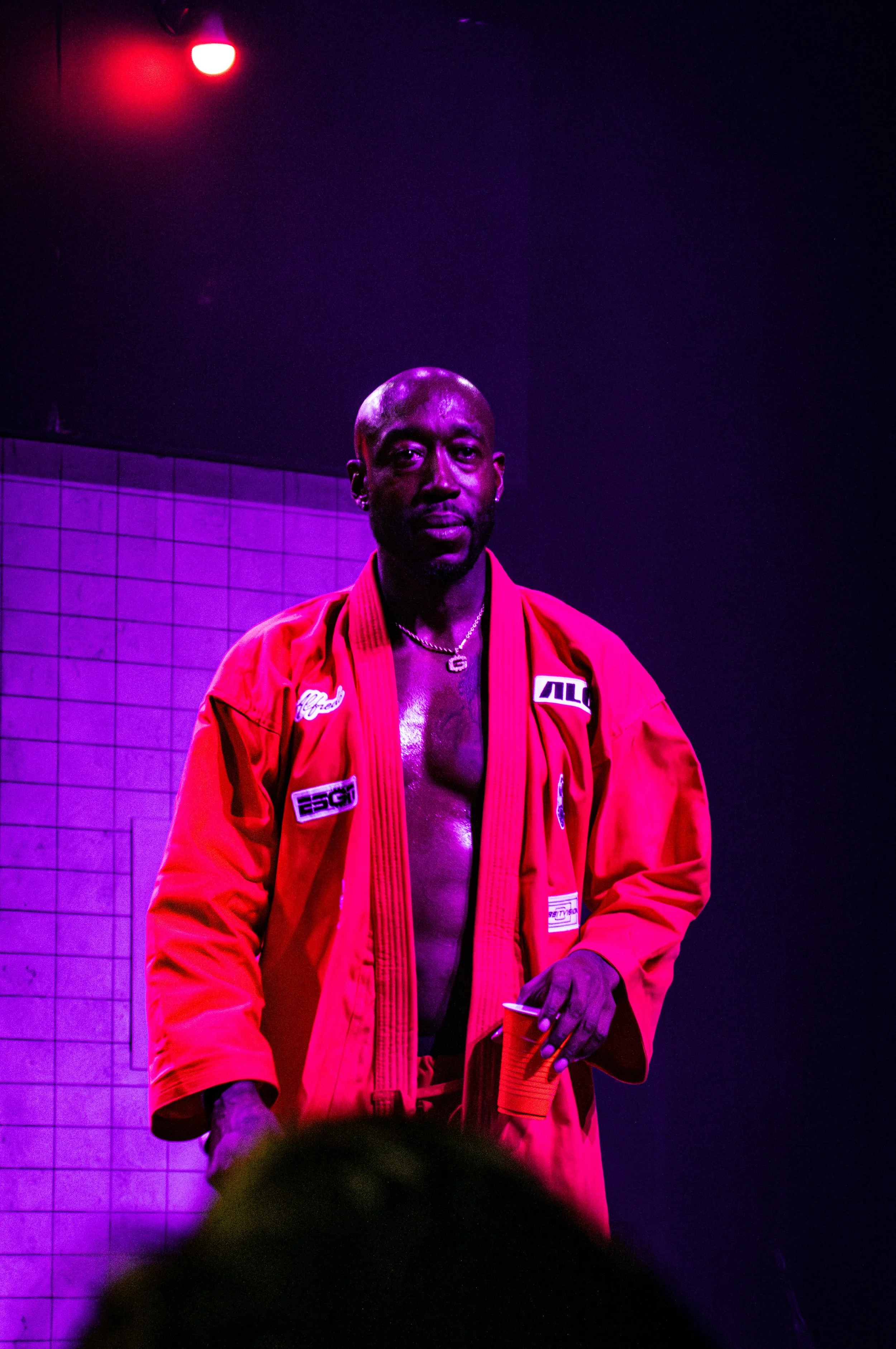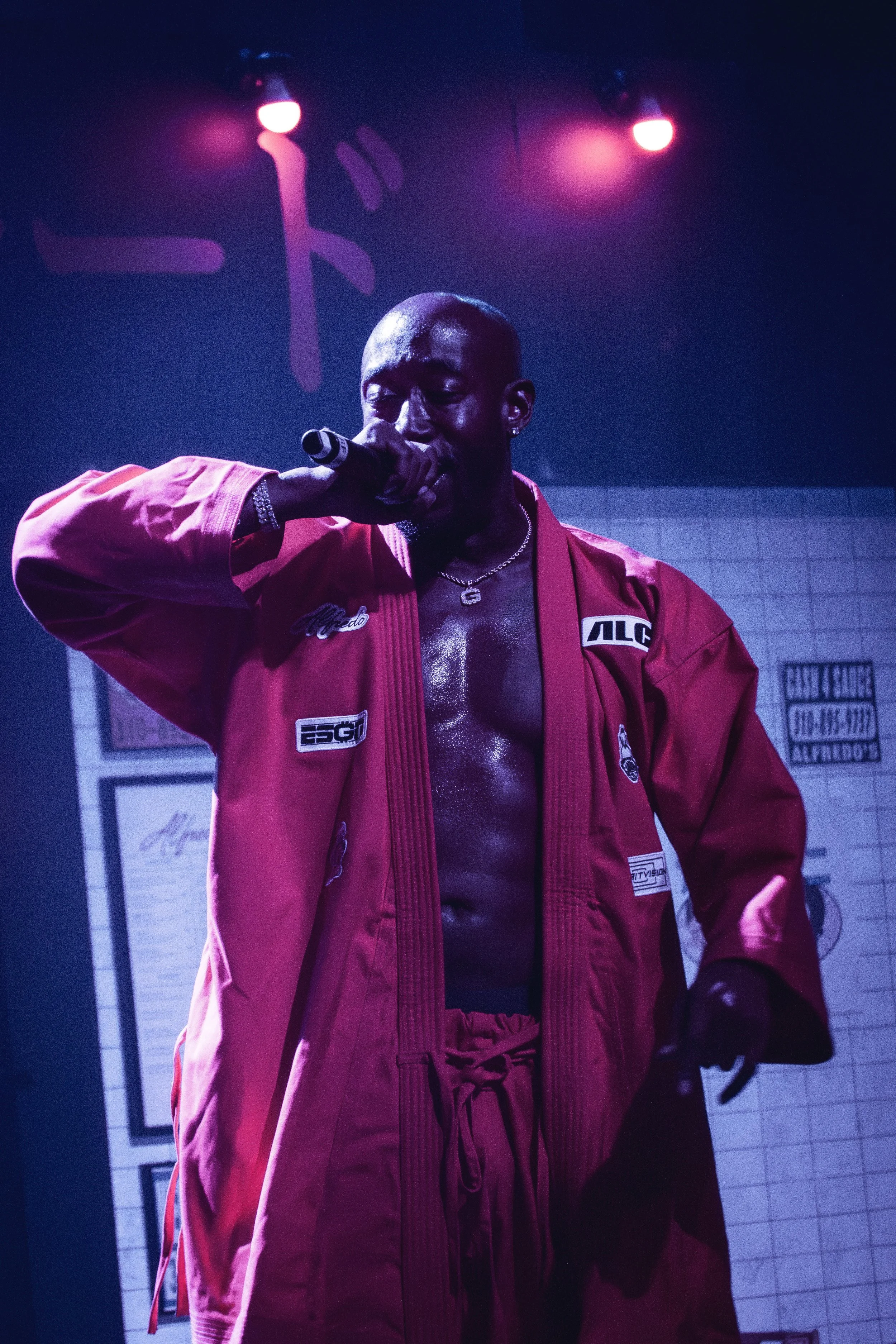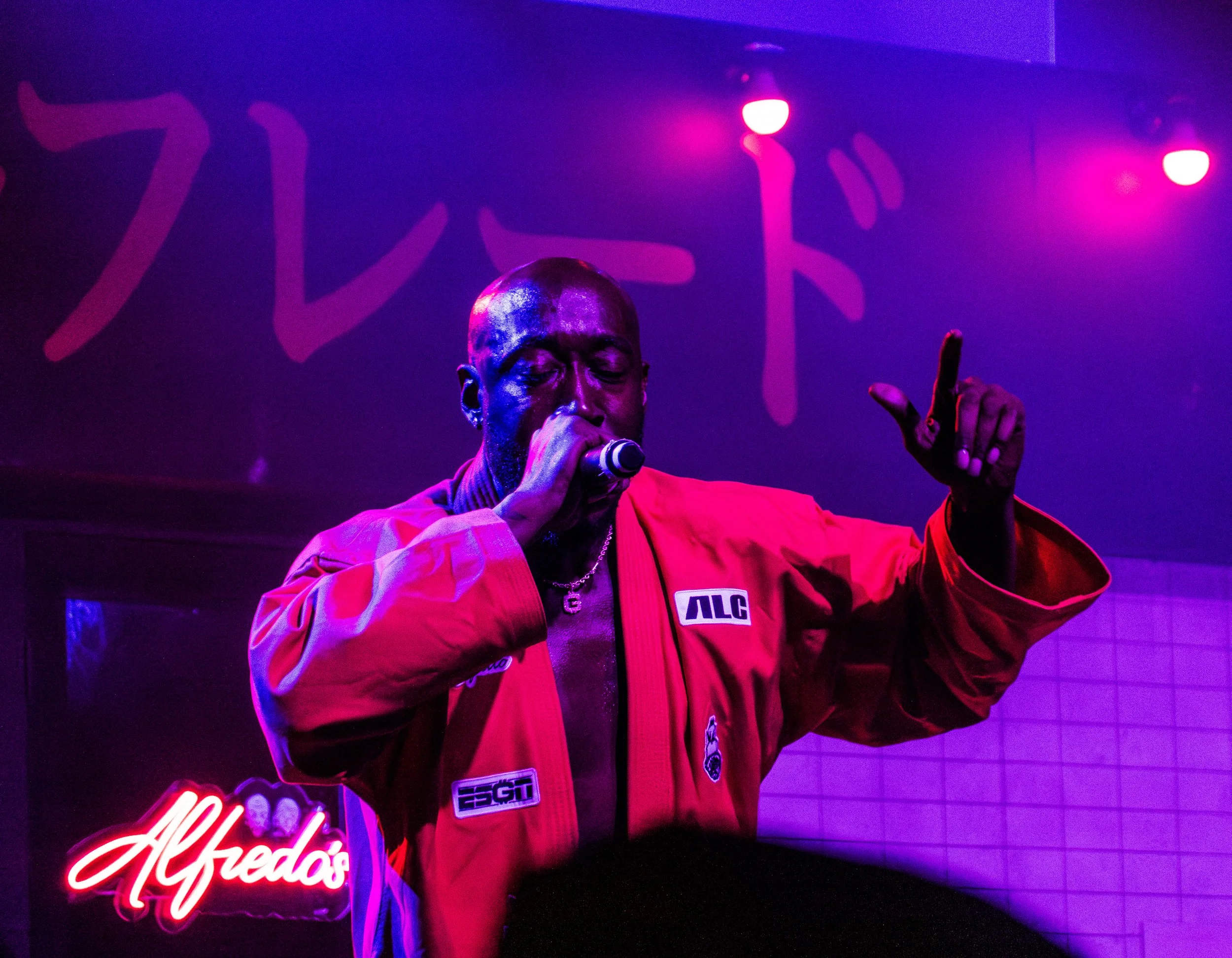 For the main event– The Alchemist came out to set the tone, and Freddie Gibbs burst out through the door of Alfredo’s restaurant wearing a Kung Fu-style robe and performing “1985”. The group tore through the first three songs of Alfredo, and followed with the first three consecutive songs of Alfredo II. There were plenty of celebrities in the house– including (Freddie Gibbs look-alike) Mahershala Ali, and Erykah Badu– who walked across the stage into the Alfredo's restaurant at one point. The rest of their remarkable set was delivered with unstoppable high-energy, spanning both Alfredo albums and a few back catalog cuts.